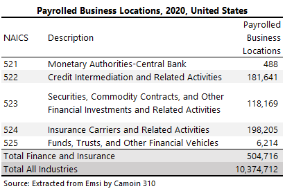 As mentioned above the local market, driven by number and concentration of people and businesses, does matter. Specifically, it matters for those segments of the finance and insurance industry that rely on customer facing interactions and relationships such as local branches, sales entities, and customer service. This includes the small to mid-size insurance agencies, financial advisories, and local and regional bank branches.