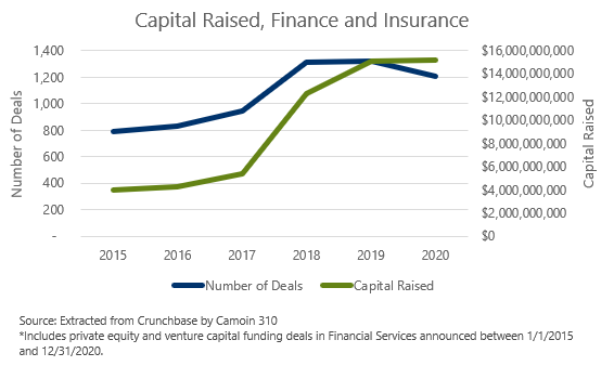 Since 2015, the amount of capital raised in finance and insurance increased from $4 billion to more than $15 billion annually. In 2020, 1,207 deals were announced.