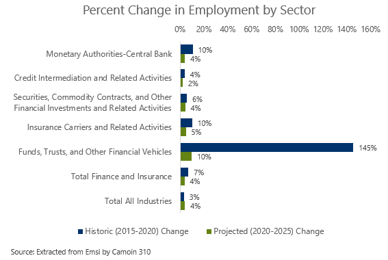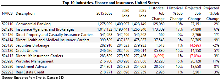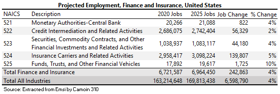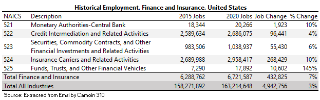 Finance and insurance industries represent 4% of all employment in the US and their growth has been outpacing the economy as a whole.