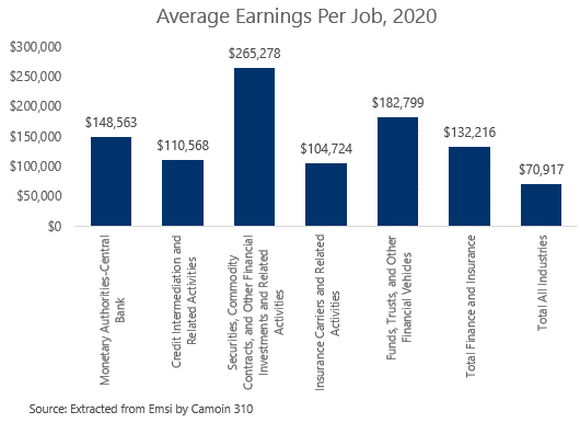 Average annual earnings in Finance and Insurance were $132,216 in 2020, considerably higher than the $70,917 for all industries, again attesting to the high value of these industries.