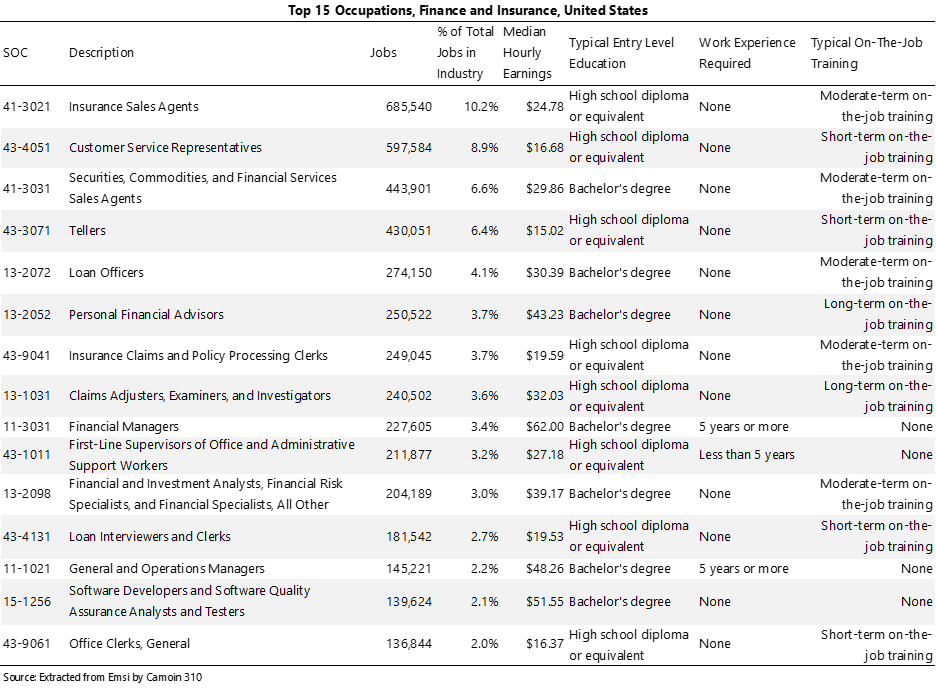 Finance and Insurance incorporates a variety of occupations with most being in sales, customer service, management, and analysts. While many require four-year degrees, there are many that do not including sales customer services and clerks. Additionally, there are plenty of entry and mid-level jobs with career paths for advancement. Insurance however does require advanced mathematics for jobs such as actuarial, and demand for computer and software skills are increasing across all of finance and insurance.