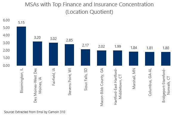 Overall finance and insurance industries exist in every region and state as they include both local services and branches as well as regional hubs and national headquarters. Some metro areas however are highly concentrated in terms of employment in these sectors including Bloomington, IL, home to State Farm Insurance; Des Moines, IA, home to Wells Fargo; Stevens Point, WI, home to Sentry Insurance; Sioux Falls, SD, home to multiple insurance, bank, and credit card companies; and Hartford, CT, home to multiple insurance companies. These are in addition to some of the larger metros in terms of number of employees including New York City, NY, Dallas, TX, Charlotte, NC, Phoenix, AZ, Salt Lake City, UT, Miami, FL, and Detroit, MI.
