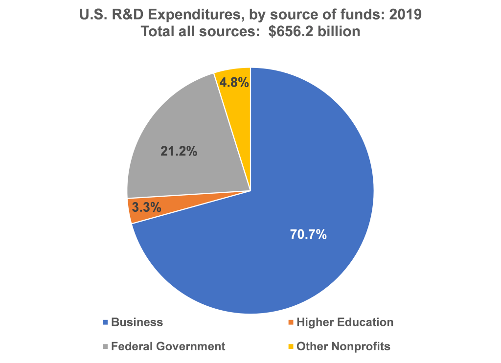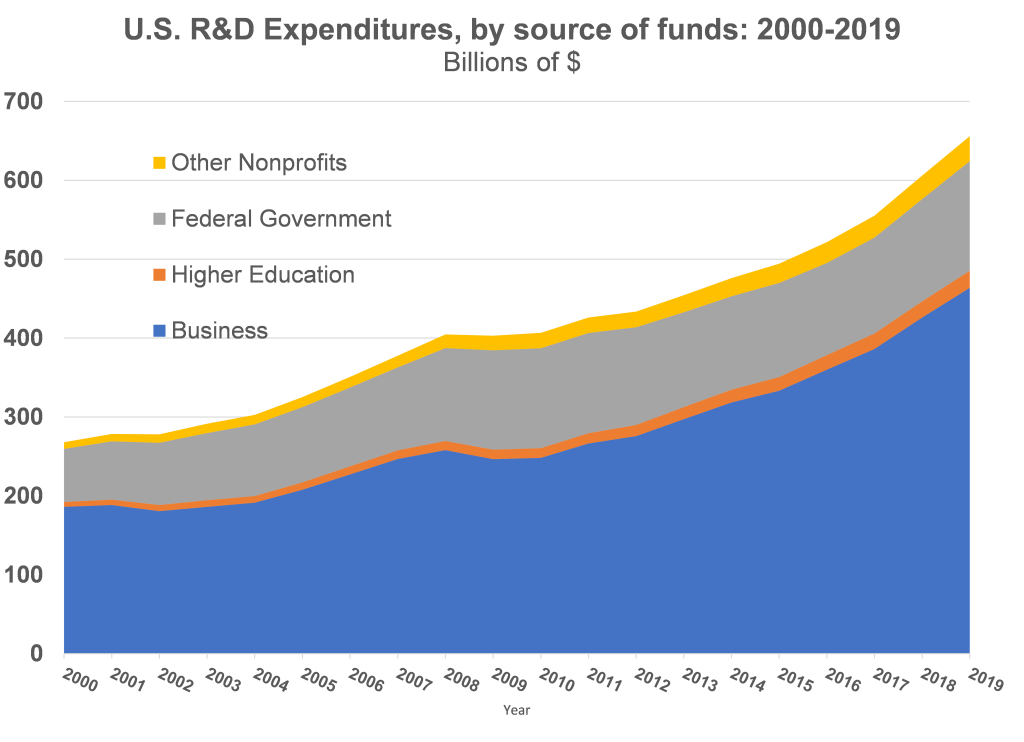 Funding by business for R&D has steadily increased as a percentage of all sources and, in 2019, totaled $463.7 billion, representing 70.7% of R&D expenditures from the major sources (see Figure 2).