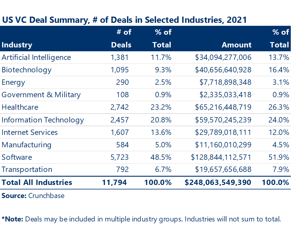 Recent data on venture capital investments supports the finding of the increasing impact of IT and digital technologies on commercialization and growth. In data gathered from CrunchBase, Camoin Associates recently tabulated and assessed venture capital deals and dollars by technology sectors and/technology areas. The 2021 data reveals significant levels of venture capital in information technology and related technologies, including artificial intelligence, internet services, and software (see Figure 3).